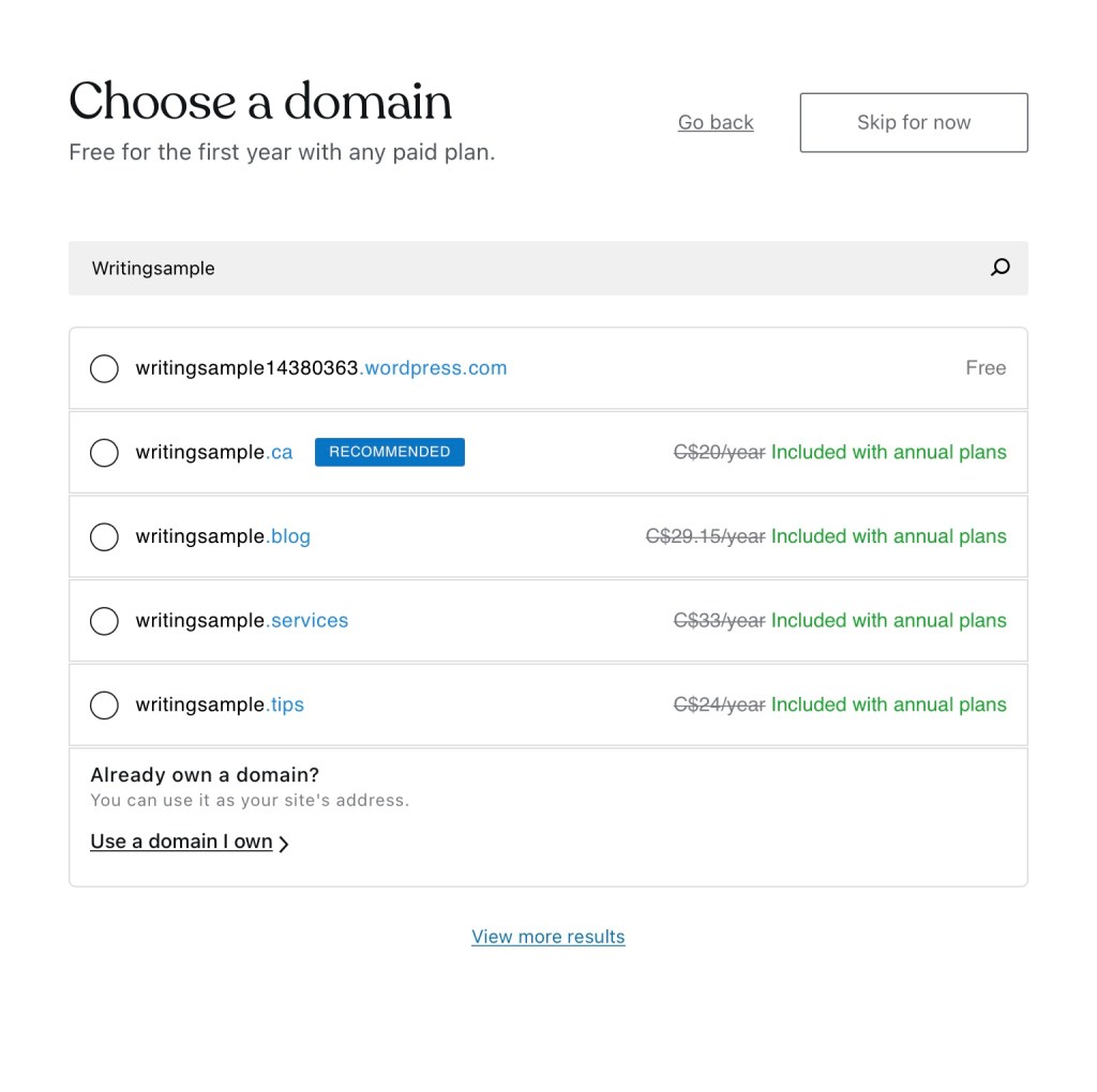 After choosing to create a website, you have to choose a name for your website. Based on that name, you will get domain name choices, like these: